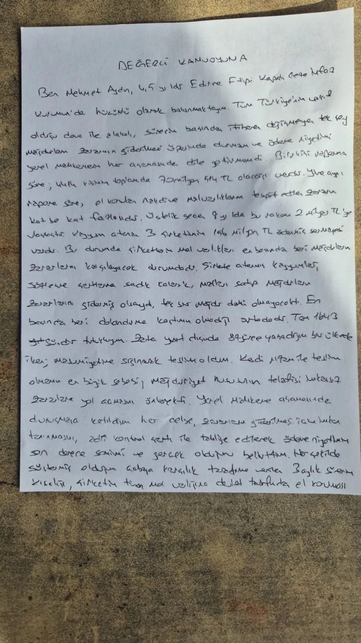 Tosuncuk lakaplı Mehmet Aydın’dan mektup